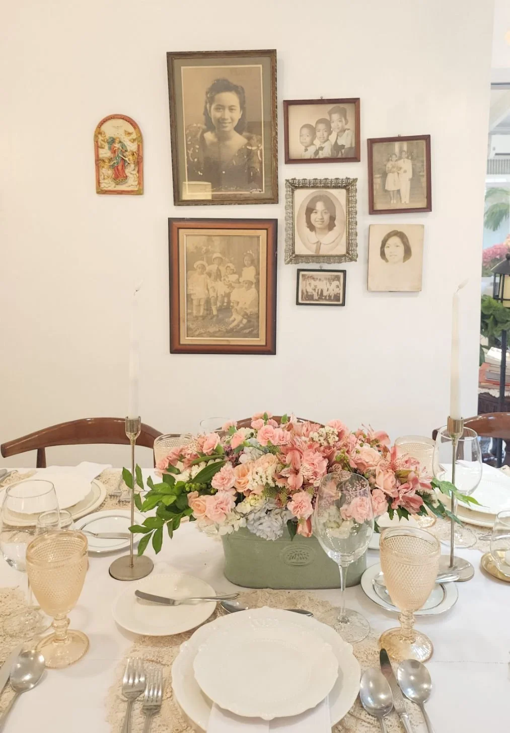Pio's Kitchen is found in the heart of Quezon City on a corner lot with white fence and gray gate. Named after the patron saint of the owner, Padre Pio. It's the ancestral home of her grandparents which was converted into a private dining space. The home showcases the era of the house with antique lamps hanging on the ceiling and a lot of key pieces original to the place that highlights the eccentric, clean, rustic feel of this mid century home.